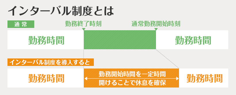 注※ インターバル制度とは勤務の終業時間と翌日開始の間を一定時間空けることにより、休息時間を確保し、実質的に労働時間を短縮させる制度