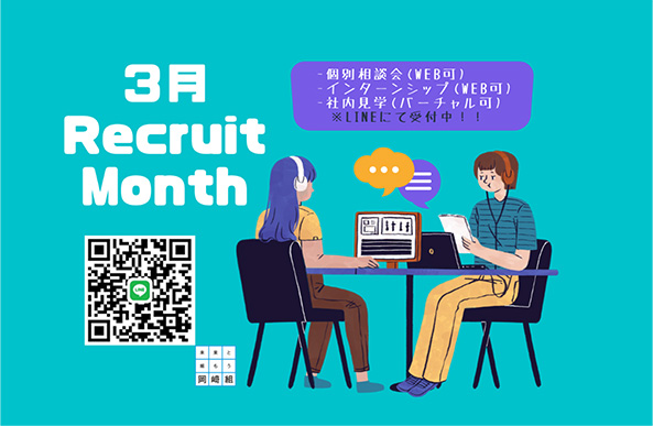 3月就職活動がOPENになりました。 そこで、岡﨑組では3月あらゆる要望にお応えする【RECRUIT Month】を開催します! どなたでもいつでもなんでも要望にお応えします☆