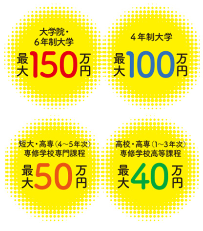 支援企業に就職して一定期間(1年、3年、5年)が経過した時に、大学等の在学中に貸与を受けた奨学金の要返還額の2分の1の額(上限あり)を交付します。