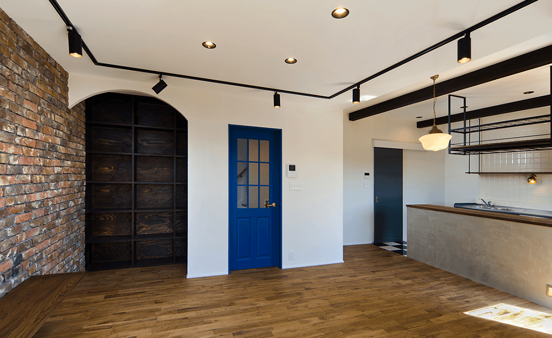 ■色合い鮮やかなレンガの壁。空間を引き締めるブラックのライトレールに、雰囲気のあるブルーのドア。いくつかの要素が違和感なく馴染んでいます。
