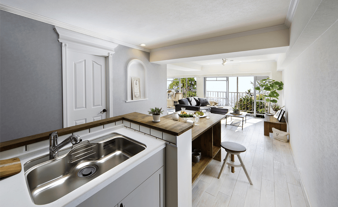 ■キッチンの白いタイルや、隣接した青いタイルのカウンター。ラフだけれど散らばりすぎない、"これぞリノベ"の空間に仕上がりました。