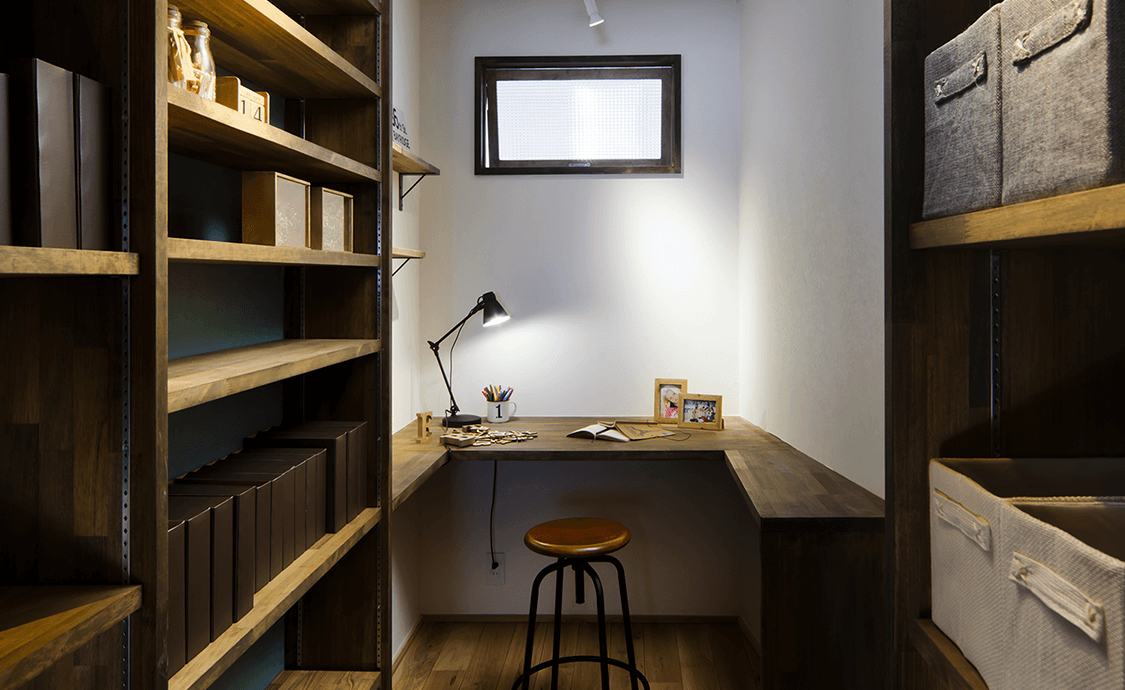 ■小窓から取り込んだ光がやさしく落ちる書斎。備え付けられた机、棚。自分だけの秘密基地です。